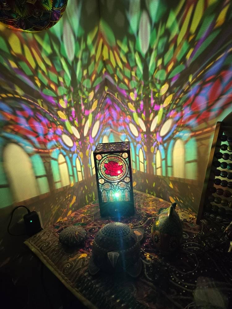 The Old as Time lamp is as beautiful as pictured when turned on and even when it's turned off. It's also feels sturdier than expected. Placed in a corner it illuminates the walls and ceiling with vibrant colors. Placed in the center of a room it can illuminate the entire ceiling of even the largest room of my house. Finding it's long-term home is going to be a challenge.