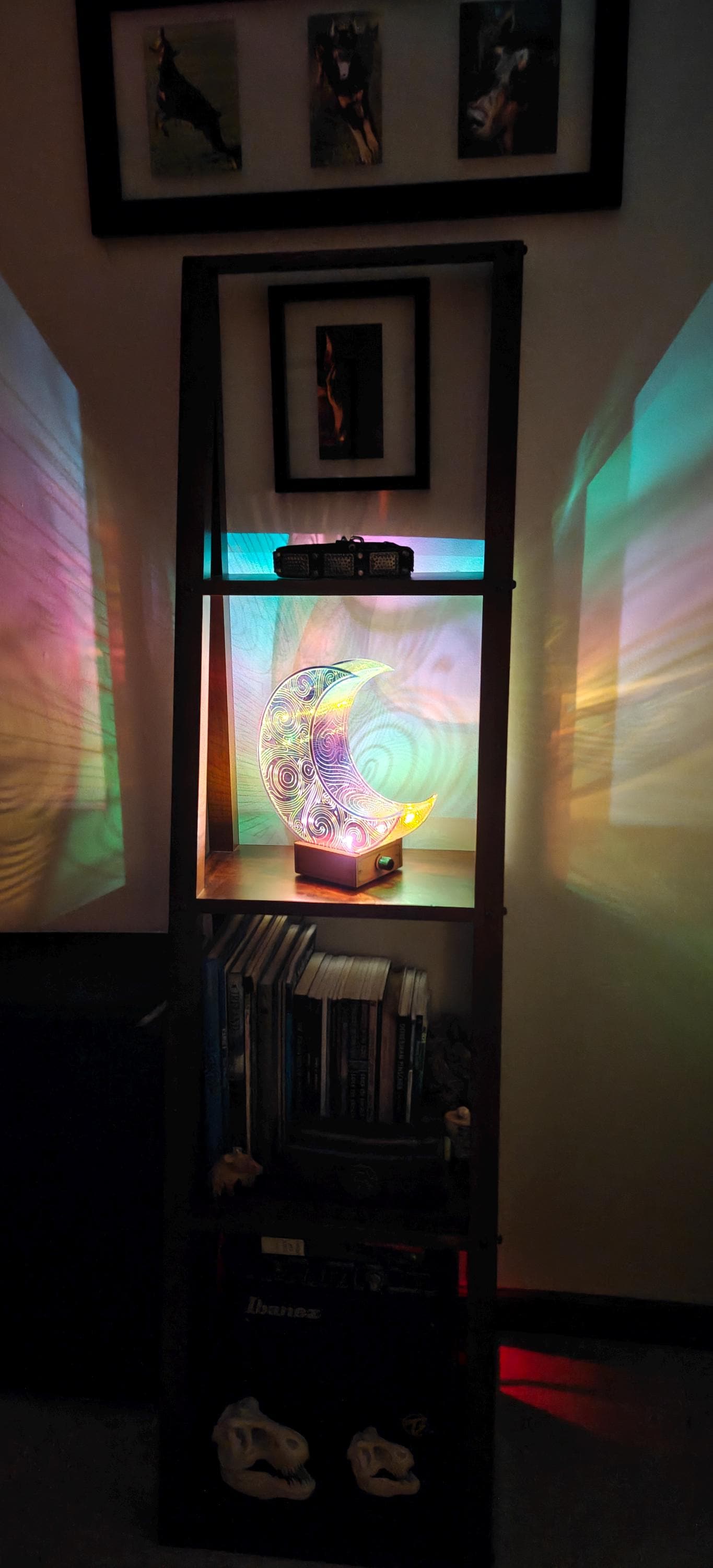 This moon-shaped shadow lamp is inspired by Van Gogh’s Starry Night, crafted by hand from layered acrylic and warm hardwood. When lit, it fills the room with swirling starbursts of gold, blue, and violet, casting a glowing, dreamlike aura that paints your walls and ceilings.