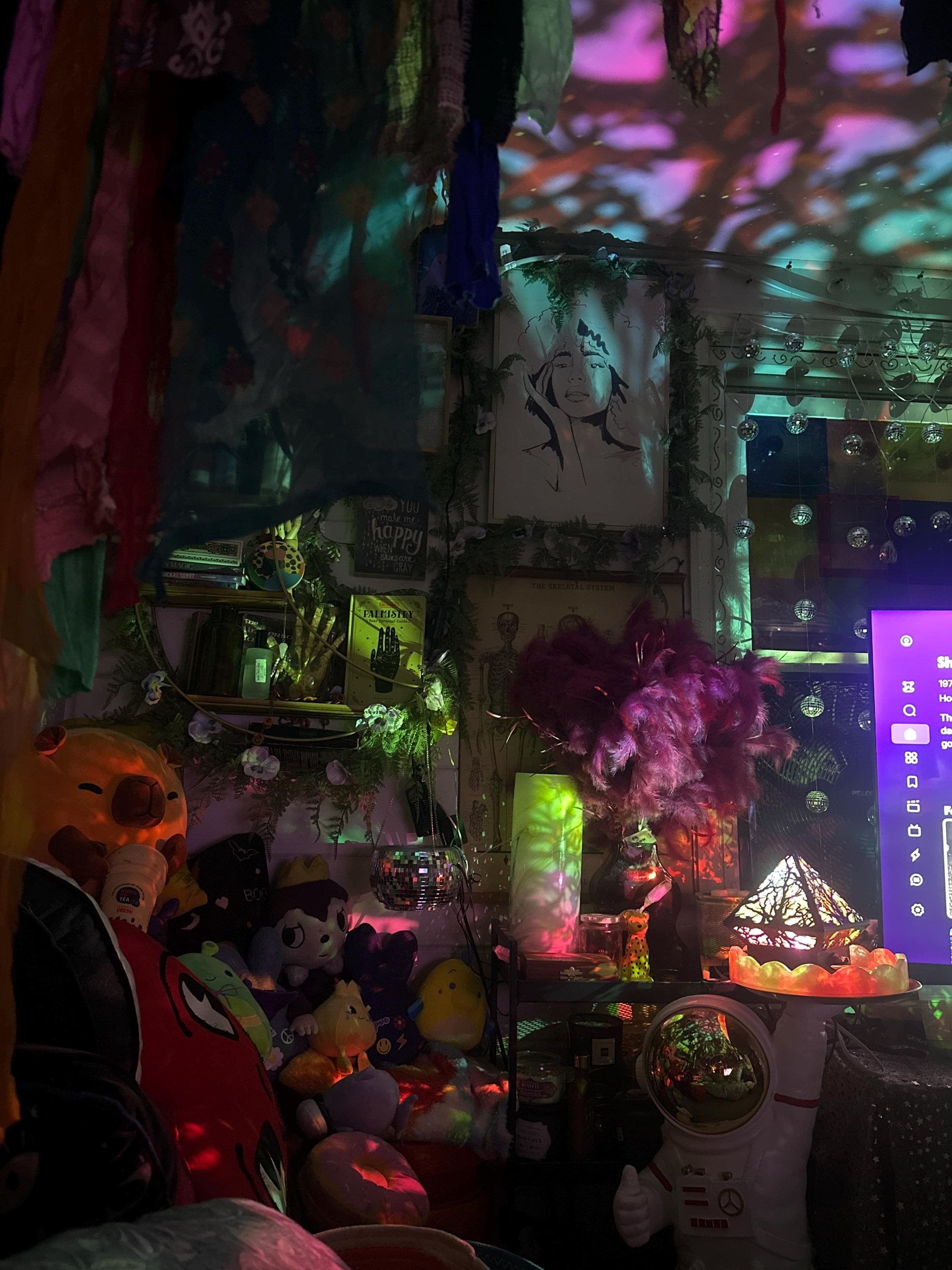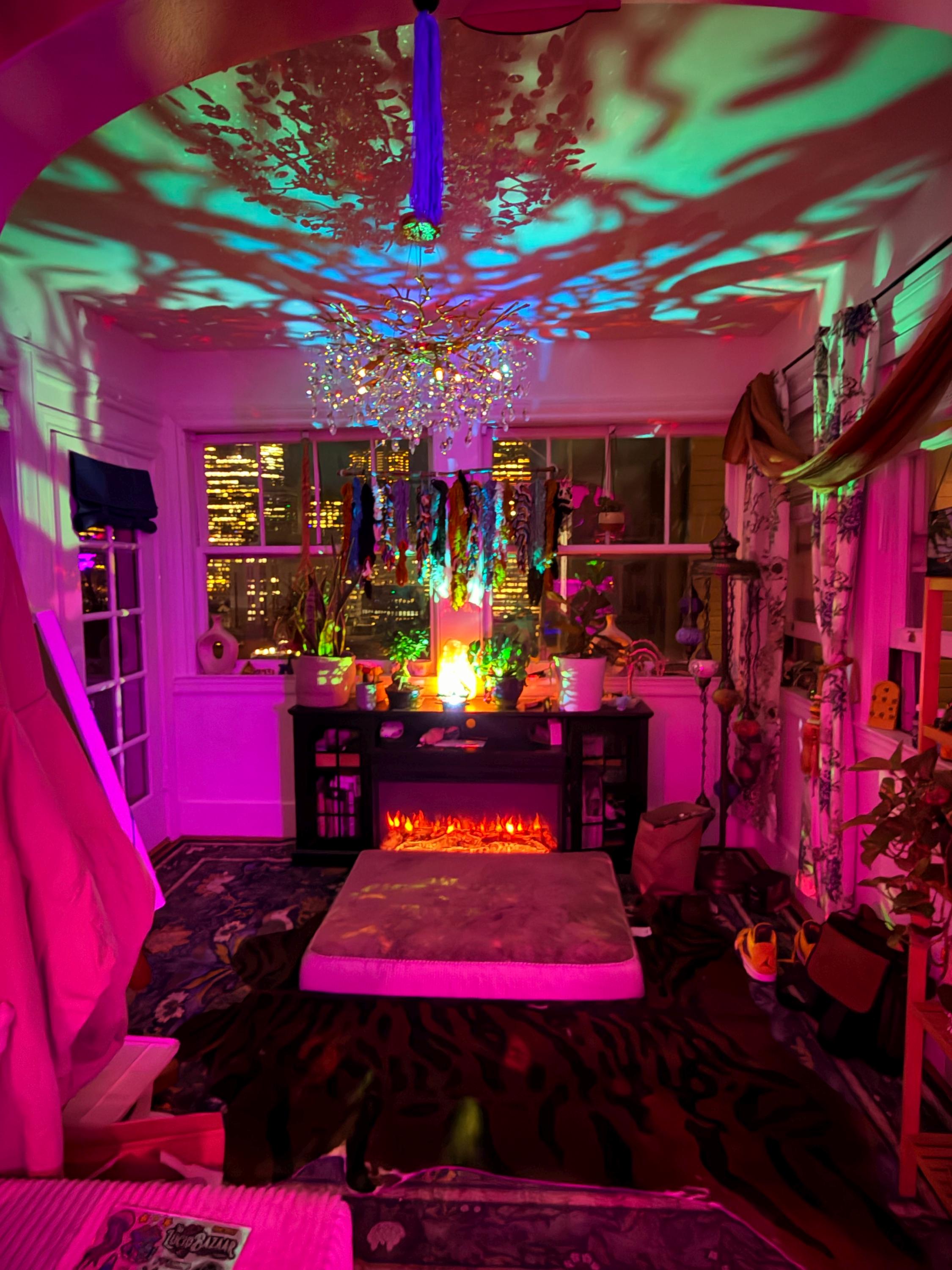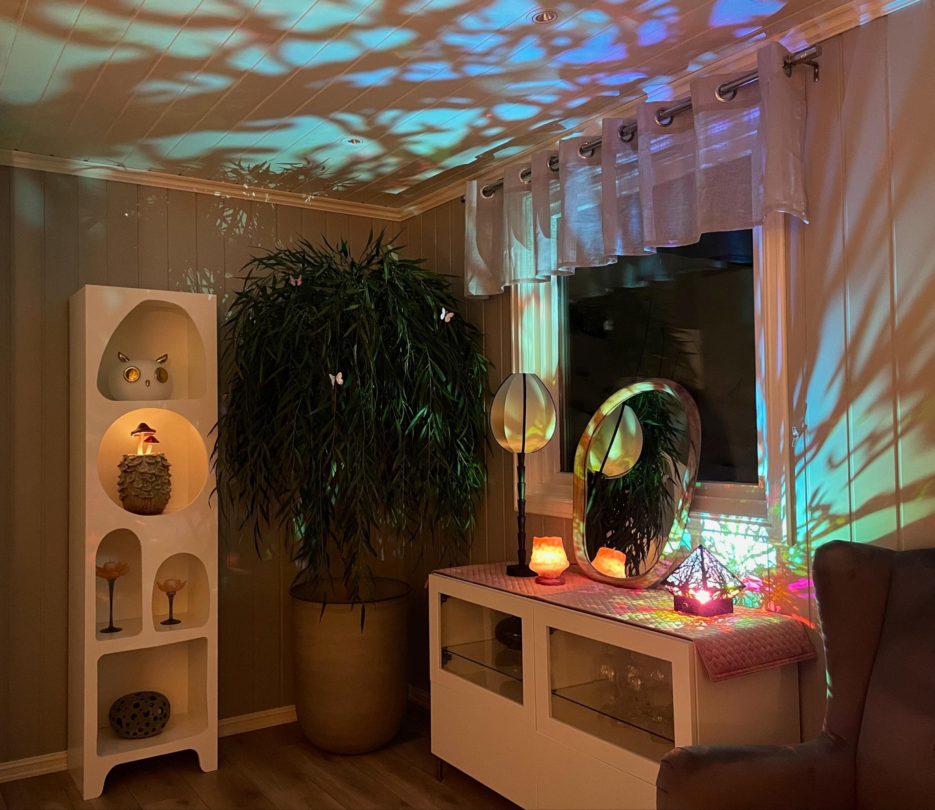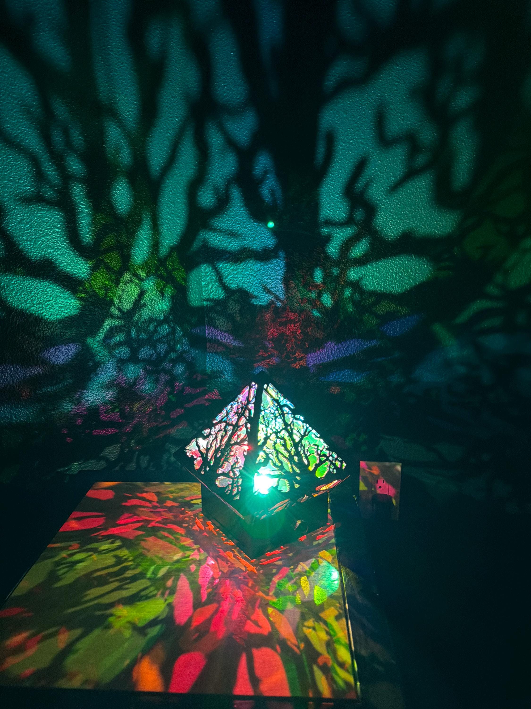 The inside of the lamp becomes an infinity-prism when turned on, and the inside of your room becomes a gorgeous fall forest <3