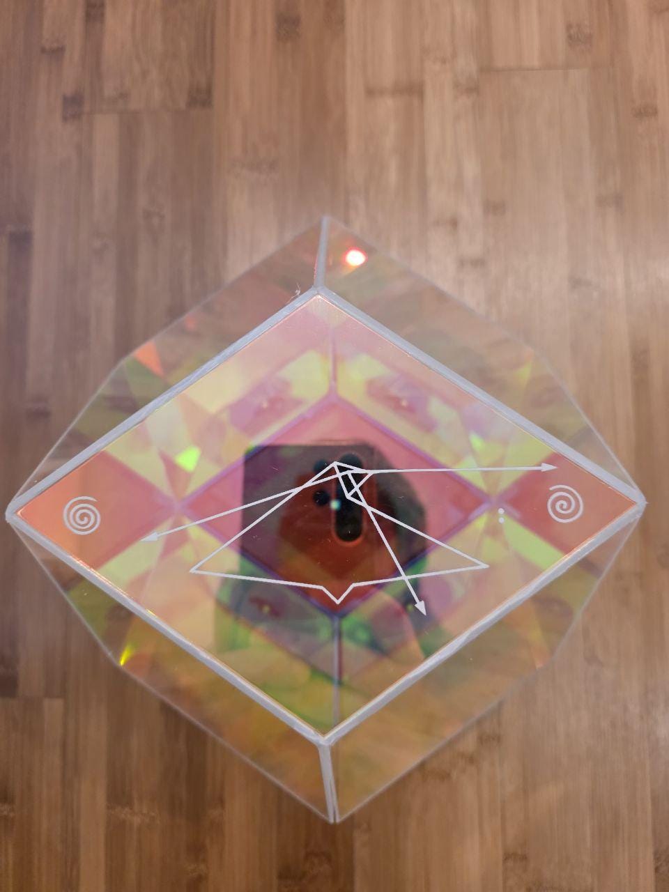 Acrylic prism lamp with stained maple hardwood trim.